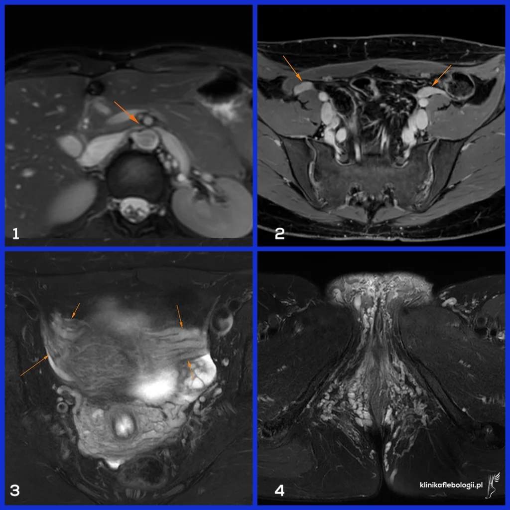 Wenografia MR (1) Ucisk lewej żyły nerkowej w miejscu typowym (2) Znacznie poszerzone żyły jajnikowe (3) Poszerzone sploty żylne przymacicz (4) Żylaki krocza i sromu. Pracownia Diagnostyki Obrazowej Centrum Medycyny Sportowej. Autor: Cezary Szary