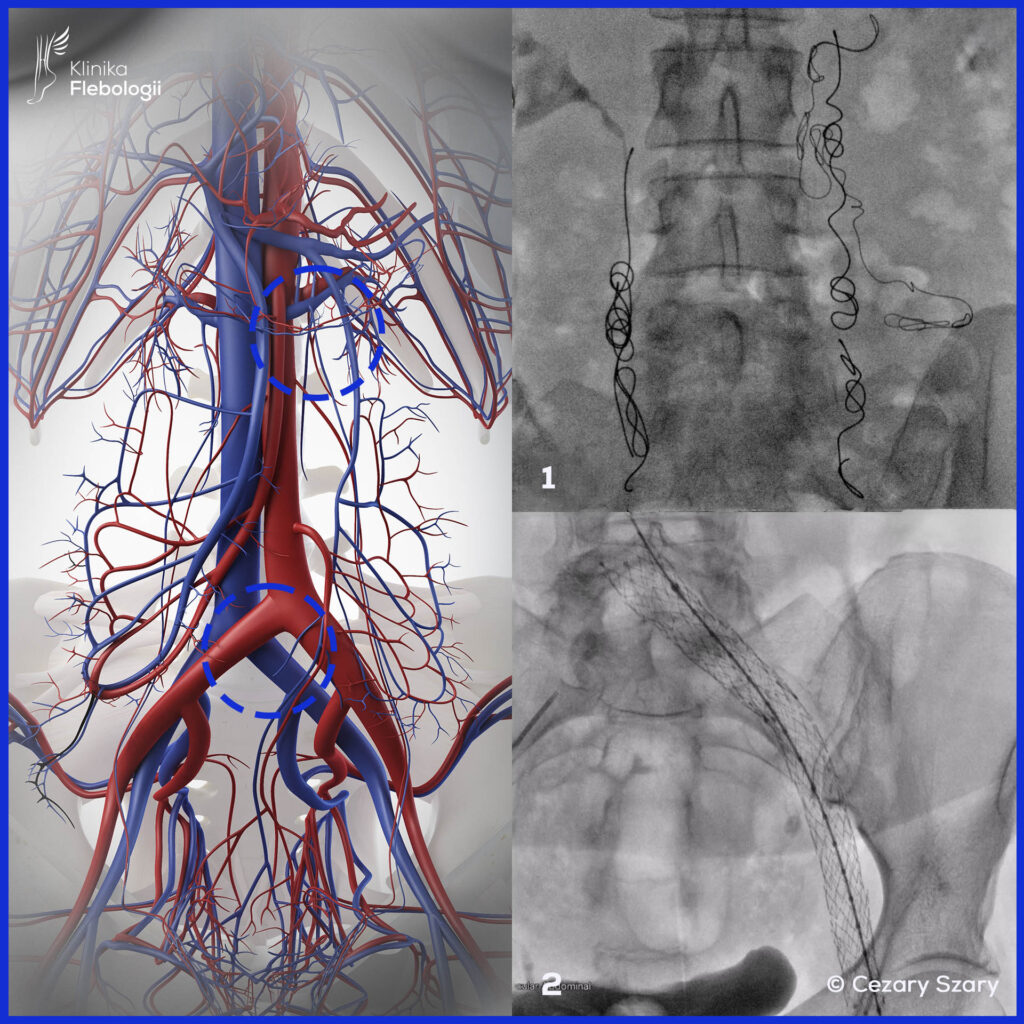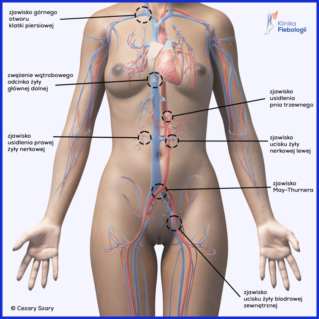 Żylne zespoły uciskowe Klinika Flebologii / Żylne zespoły uciskowe Wprowadzenie Opis schorzenia Czynniki ryzyka Sposoby leczenia Często zadawane pytania Niewydolność żylna miednicy u kobiet Niewydolność żylna miednicy u mężczyzn Wprowadzenie Żylne zespoły uciskowe (ang. venous compression syndromes) to szeroka grupa schorzeń naczyniowych, wrodzonych i wtórnych, w których dochodzi do zaburzeń odpływu krwi żylnej na skutek ucisku na naczynia żylne. Ucisk ten może być spowodowany przez sąsiadujące struktury anatomiczne, takie jak: tętnice, mięśnie czy więzadła (ścięgna), a także przez patologiczne zmiany w obrębie samych naczyń żylnych (np. przegrody naczyniowe). Z tego powodu zaburzenia rozwojowe naczyń żylnych (np. hipoplazję pnia żylnego) również wrzuca się do tego worka, jako że daje podobne objawy kliniczne. Najczęstszymi przykładami żylnych zespołów uciskowych są zespół „dziadka do orzechów” (ang. nutcracker syndrome, NCS) oraz zespół May-Thurnera (ang. May-Thurner syndrome, MTS). Schorzenia te stanowią ważny problem kliniczny z uwagi na poważne konsekwencje krążeniowe oraz zakrzepowo-zatorowe. Powodują zaburzenia odpływu krwi żylnej, wtórną redystrybucję krążenia i nierzadko masywny zastój krwi żylnej, który skutkuje rozwojem niewydolności żylnej miednicy (zarówno u mężczyzn jak i u kobiet) oraz wtórną niewydolność żylną kończyn dolnych. Zjawisko czy żylny zespół uciskowy? Warunkiem koniecznym do wystąpienia objawów żylnego zespołu uciskowego jest wystąpienie pewnego zjawiska anatomicznego, bądź innego mechanizmu patofizjologicznego. Żylne zjawisko uciskowe możemy porównać do przyczyny, zaś żylny zespół uciskowy do skutku, który charakteryzuje się pewnymi objawami (dokładniej występowaniem pewnego spektrum objawów). Czasem spotyka się pewną konstelację zjawisk sprawczych, a nie jedną uchwytną przyczynę. Należy o tym pamiętać, diagnozując Pacjentów z podejrzeniem żylnego zespołu uciskowego. Zjawisko uciskowe (ew. zjawisko usidlenia ujawniające się czynnościowo) bywa na początku procesem czysto hemodynamicznym, często bezobjawowym (tak dzieje się w dzieciństwie). Dopiero jego długotrwałe działanie, rozwój człowieka oraz postępująca dekompensacja układu żylnego, prowadzą do szeregu niekorzystnych objawów, definiujących danych żylny zespół uciskowy. Naczynie uciskane przewlekle (może być również wyjściowo wąskie) staje się ścieńczałe. Z czasem może włóknieć i ulegać nieodwracalnym zmianom. Żylnych zjawisk uciskowych w organizmie człowieka jest dość sporo (część zilustrowaliśmy na schemacie obok), ale tylko niektóre są klinicznie istotne i na tyle częste, że każdy lekarz powinien zdawać sobie sprawę z ich występowania. Schemat anatomiczny przedstawiający najczęstsze zjawiska uciskowe i zmiany anatomiczne prowadzące do odpływu krwi żylnej w ciele człowiek. Autor: dr n. med. Cezary Szary © Klinika Flebologii Do najczęstszych żylnych zespołów uciskowych należą: zespół ucisku żyły podobojczykowej (ang. thoracic outlet syndrome, TOS) – zjawisko ucisku wynika z istnienia kompresji żyły podobojczykowej przez struktury kostno-więzadłowe górnego otworu klatki piersiowej. Sam zespół żylny objawia się bólem, parestezjami, obrzękiem i zasinieniem kończyny górnej. zespół „dziadka do orzechów” (ang. NCS) – w tym przypadku zjawiskiem uciskowym jest przewlekła kompresja lewej żyły nerkowej przez tętnicę krezkową górną. Wynika ona z dość wąskiego kąta odejścia tętnicy krezkowej górnej od aorty brzusznej i zazwyczaj małej zawartości tkanki tłuszczowej w przestrzeni zaotrzewnowej. Prowadzi to z czasem do rozwoju objawów, czyli zespołu „dziadka do orzechów” (np. ból w okolicy lędźwiowej, kolka przy bieganiu, krwinkomocz w dzieciństwie, bolesne i obfite miesiączki, bóle podbrzusza, żylaki powrózka nasiennego na wczesnym etapie życia czy niewydolność żylna kończyn dolnych przed 25 rokiem życia). zespół May-Thurnera (ang. MTS) – tutaj zjawisko uciskowe wynika z bliskich relacji anatomicznych pomiędzy lewą żyłą biodrową wspólną a prawą tętnicę biodrową wspólną. Długotrwałe dociskanie żyły do kręgosłupa na wysokości L4/L5 skutkuje występowaniem zespołu objawów obejmujących m.in.: ból i obrzęk kończyny dolnej lewej, później rozwój objawów typowych dla niewydolności żylnej miednicy, aż wreszcie do zmian zakrzepowych w osi biodrowo-udowej lewej (największe ryzyko zakrzepowej postaci zespołu May-Thurnera występuje u kobiet w ciąży). Czynniki zwiększające ryzyko wystąpienia żylnego zespołu uciskowego wrodzone anomalie naczyniowe (nieprawidłowe odejście naczyń, ich przebieg lub kąt rozwidlenia) obecność dodatkowych struktur anatomicznych budowa ciała (wysokie i szczupłe osoby są bardziej predysponowane) wady strukturalne kręgosłupa (np. skolioza lub uwydatniona lordoza L/S) płeć żeńska liczba ciąż i porodów choroba nowotworowa (np. chłoniak) tętniaki, kręty układ naczyń tętniczych zmiany zwyrodnieniowe (wytwórcze) kręgosłupa lędźwiowego, rzadziej piersiowego kręgozmyk w odcinku lędźwiowym kręgosłupa Mechanizm powstawania zespołu „dziadka do orzechów” Hipoplazja lewej żyły nerkowej jest częstszą przyczyną tzw. zespołu „dziadka do orzechów” niż klasyczny (historyczny) wariant przedstawiany w podręcznikach, polegający na ucisku żyły nerkowej przez tętnicę krezkową górną. Pamiętajmy, że zespół ten został po raz pierwszy opisany w roku 1937, w erze braku diagnostyki obrazowej. Ten istotny czynnik rozwojowy, polegający na niepełnym wykształceniu się żyły nerkowej w okresie embrionalnym, skutkuje zwężeniem jej światła i upośledzeniem odpływu krwi z nerki już od najmłodszych lat życia. Najbardziej odczuwalne staje się to dla organizmu w okresie d