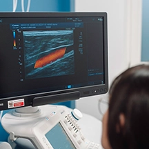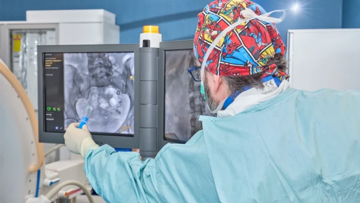Lekarze naszego zespołu są pionierami tzw. przyczynowego leczenia choroby żylnej. Ideą leczenia przyczynowego jest dążenie do usunięcia źródła problemu, którym najczęściej jest niewydolność żylna miednicy, często spowodowana wadami anatomicznymi, przeciążeniem objętościowym układu żylnego (np. wielokrotne ciąże) lub innymi czynnikami, do których współcześnie należy intensywne uprawianie sportów siłowych. Diagnostyka w tym podejściu pełni rolę kluczową. Obejmuje całościową ocenę układu żylnego w badaniu USG Doppler oraz zaawansowane badania obrazowe, takie jak wenografia MR czy TK. Proces terapeutyczny składa się zazwyczaj z kilku etapów i wykorzystuje strategię leczenia zstępującego, zwanego inaczej sekwencyjnym. Postępowanie terapeutyczne rozpoczyna się od małoinwazyjnego wyleczenia niewydolności żylnej miednicy, a następnie, w zależności od potrzeb i wyników, rozszerza się je na leczenie niewydolności żylnej w innych częściach układu żylnego, np. na poziomie dna miednicy czy w kończynach dolnych. W wielu przypadkach połączenie obu strategii – leczenia przyczynowego i zstępującego – zapewnia najlepsze rezultaty w leczeniu niewydolności żylnej.