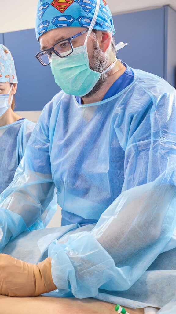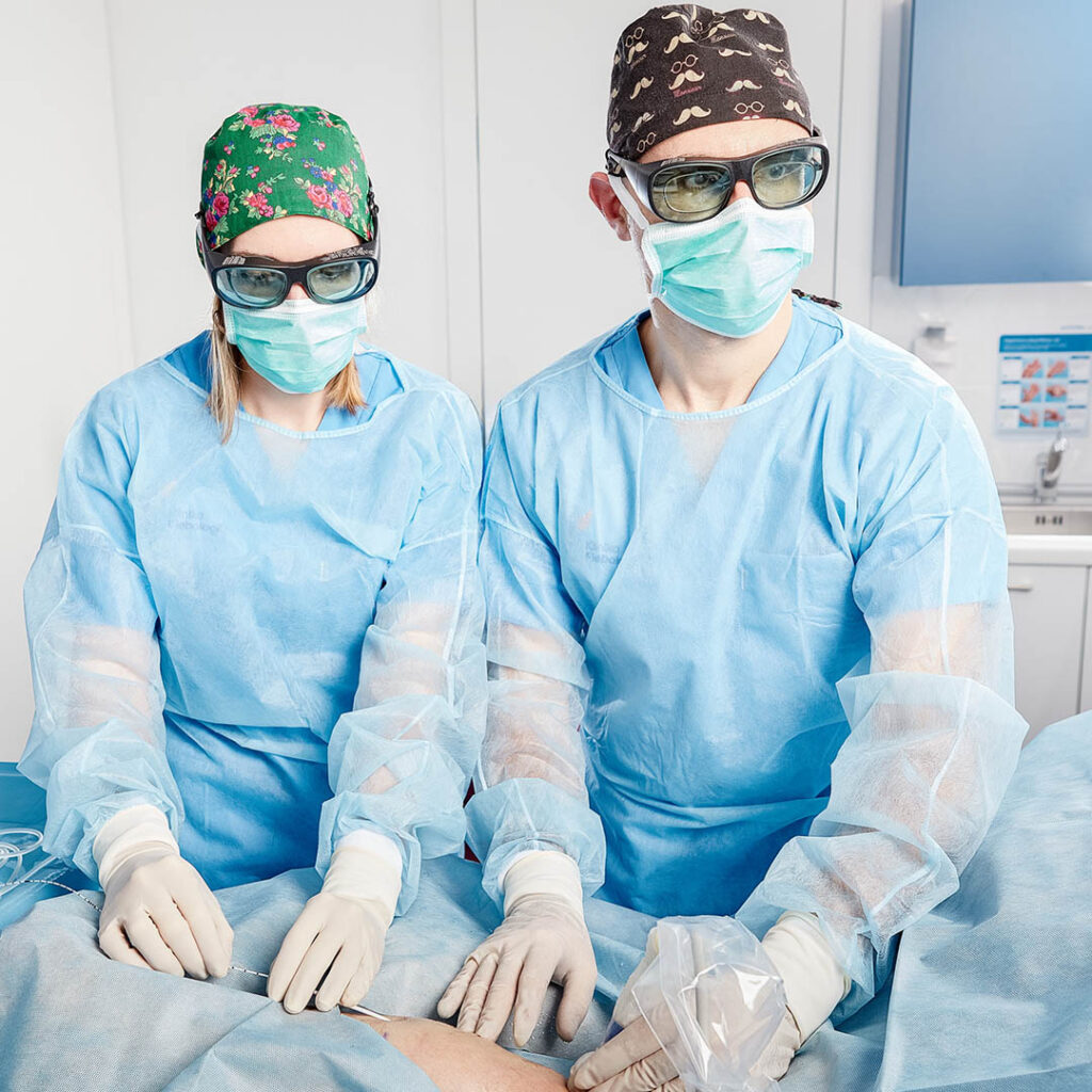 Laserowe zamykanie żył Klinika Flebologii / Usługi / Zabiegi żylne / Laserowe zamykanie żył Wprowadzenie Kluczowe informacje Opis zabiegu Klejenie żył Skleroterapia kompresyjna Wprowadzenie Laserowa ablacja wewnątrzżylna (and. EndoVenous Laser Ablation, EVLA), znana również jako EVLT (ang. EndoVenous Laser Therapy), to nowoczesna i małoinwazyjnainwazyjna metoda leczenia niewydolności żylnej, w tym żylaków kończyn dolnych. Zalicza się to technik termicznych, wykorzystujących energię lasera do precyzyjnego i skutecznego zamknięcia niewydolnych segmentów żylnych bądź całych pni naczyniowych. Podczas zabiegu, do wnętrza zmienionej chorobowo żyły wprowadzane jest cienkie włókno laserowe (światłowód), które emituje bliskie promieniowanie podczerwone o ściśle określonej długości fali i energii. Powoduje to rozgrzanie i obkurczenie ściany naczynia. Laseroterapia wewnątrzżylna stanowi alternatywę dla chirurgicznego usuwania żylaków, a jej główną zaletą jest mała inwazyjność i wysoka skuteczność. Metoda ta pozwala na skuteczne zamykanie niewydolnych pni żylnych, takich jak żyły odpiszczelowa i odstrzałkowa, a także ich większych gałęzi i perforatorów, czyli żył przeszywających. Obecnie EVLA jest najskuteczniejszą metodą zamykania niewydolnych pni żylnych, charakteryzującą się wysokim wskaźnikiem powodzenia na poziomie 96-98% zamkniętych żył po 5 latach od wykonania zabiegu. W porównaniu do innych metod termicznych, takich jak ablacja termiczna parą wodną (ang. Steam Vein Sclerosis, SVS) czy ablacja termiczna falą radiową (ang. EndoVenous RadioFrequency, EVRF), EVLA cechuje się również niskim ryzykiem powikłań, brakiem blizn i minimalnymi dolegliwościami bólowymi w okresie pooperacyjnym. Leczenie przy użyciu lasera wewnątrzżylnego przekłada się na szybki powrót do codziennych aktywności po zabiegu. Precyzyjne i kontrolowane działanie lasera w obrębie zmienionej chorobowo żyły minimalizuje wpływ na otaczające tkanki. Zabieg EVLA przeprowadzany jest ambulatoryjnie, w znieczuleniu miejscowym, co dodatkowo zwiększa komfort Pacjenta. Lasery wewnątrzżylne we współczesnej flebologii Rozwój technik laserowych w leczeniu niewydolności żylnej kończyn dolnych był stopniowy z pewnymi momentami przełomowymi. Pierwsze lasery wewnątrzżylne (inaczej endożylne lub endowaskularne) użyte były w latach 2000-2008. Ich systemy działały na długości fali 810, 940 i 980 nm. W tych systemach główną rolę odgrywała uszkadzającą odgrywała absorpcja światła w hemoglobinie zawartej w krwinkach. Chociaż były skuteczne, to ich używanie wiązało się z dużo większym ryzykiem powikłań i dyskomfortem pooperacyjnym. Prawdziwy przełom w technikach endożylnych laserowych nastąpił w 2008 roku wraz z wprowadzeniem laserów o długości fali 1470 nm, których działanie opiera się głównie na absorpcji w wodzie zawartej w ścianie naczynia żylnego. Ta zmiana, w połączeniu z wprowadzeniem światłowodów radialnych (pierścieniowych) a później 2-pierścieniowych, znacząco zwiększyła bezpieczeństwo i komfort zabiegów wewnątrzżylnych. W 2019 roku wprowadzono laser 1940 nm, otwierając nowy rozdział w rozwoju tej technologii. System do laserowej ablacji wewnątrzżylnej (ELVeS) System laserowy ELVeS – wykorzystujący światłowody dwupierścieniowe (Radial 2ring) firmy Biolitec reprezentuje najnowocześniejszą technologię laseroterapii wewnątrzżylnej. Współczesne zabiegi EVLA wykorzystują zaawansowane technologie laserowe i specjalnie stworzone w tym celu światłowody. Umożliwiają one bezpieczne i efektywne leczenie niewydolnych naczyń żylnych. W Klinice Flebologii najczęściej wykorzystujemy system laserowy ELVeS 1470 nm z włóknami 2-pierścieniowymi. Na podstawie obecnych obserwacji i badań klinicznych najlepsze efekty terapeutyczne uzyskuje się laserem o długości fali 1470 nm. W przypadku fali 1940 nm bezpieczniej co prawda zamyka się naczynia płytko położone pod skórą, osiąga się jednak gorsze wyniki leczenia z uwagi na jego 5 razy większą absorpcję w wodzie niż lasera 1470 nm. Jego działanie jest dużo płytsze w samej ścianie naczynia żylnego, co prowadzi do gorszych wyników w leczeniu większych naczyń żylnych. System laserowy ELVeS wykorzystujący światłowody dwupierścieniowe (Radial 2ring) ma wiele zalet. Poniżej znajduje się kilka najistotniejszych. Zalety laserowej ablacji żylnej systemem ELVeS skuteczność pozabiegowa sięga 96% w obserwacjach ponad 5-letnich; system umożliwia skuteczne zamykanie dużych żył o średnicy powyżej 10 mm; innowacyjna konstrukcja światłowodu 2ring (energia światła lasera jest rozdzielona na dwa pierścienie emisyjne oddalone od siebie o 6 mm) powoduje obkurczenie wstępne a następnie jego domknięcie przez wiązkę pochodzącą z drugiego pierścienia; minimalne ryzyko uszkodzenia ściany naczynia dzięki równomiernemu rozkładowi energii; praktycznie zerowe ryzyko uszkodzenia okolicznych tkanek i nerwów przy prawidłowej technice znieczulenia tumescencyjnego; zabieg jest praktycznie bezbolesny dzięki precyzyjnemu znieczuleniu tumescencyjnemu; minimalne ryzyko karbonizacji końcówki światłowodu; dzięki włóknom Radial 2ring slim (wyjątkowo cienkim i mobilnym) leczenie wąskich i krętych żył stało się jeszcze prostsze. Zabieg ELVeS wykonywany jest w Klinice Flebologii w sposób autorski – zgodnie z filozofią przyczynowego (zstępującego) leczenia choroby żylnej. Flebolog: Cezary Szary. © Klinika Flebologii Kluczowe informacje dotyczące zabiegu żylnego Rodzaj znieczulenia nasiękowe i tumescencyjne Czas trwania zabiegu 25-90 minut Leczenie główne pnie żylne, żylaki, żyły przeszywające, krążenie oboczne, malformacje żylne Ryzyko powikłań znikome ryzyko powikłań Aktywność fizyczna szybki powrot do codziennych aktywności Rekonwalescencja do 7-14 dni (okres no