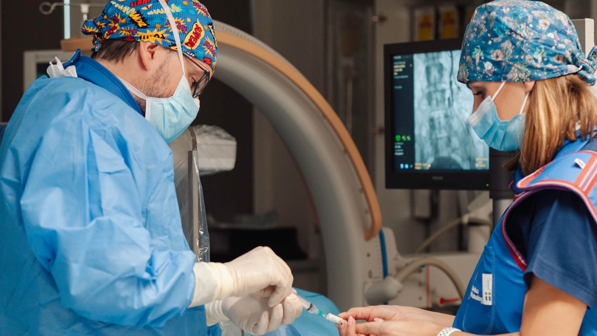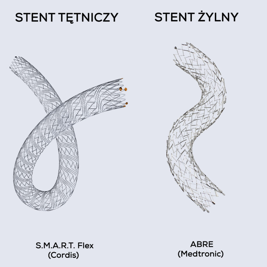 Stentowanie żył Klinika Flebologii / Usługi / Zabiegi żylne / Stentowanie żył Wprowadzenie Kluczowe informacje Opis zabiegu Embolizacja żylna Wenoplastyka żylna Wprowadzenie Niedrożność żył głębokich, definiowana jako zwężenie lub całkowite zamknięcie naczynia żylnego, jest poważnym problemem zdrowotnym, który dotyka wielu Pacjentów na świecie. Może być następstwem przebytej zakrzepicy żył głębokich lub wynikać z przewlekłego ucisku naczyń żylnych. Nieleczona niedrożność żylna może prowadzić do niewydolności żylnej miednicy oraz pełnoobjawowego zespołu pozakrzepowego z występowaniem takich objawów jak: przewlekłe bóle kończyn, obrzęki, zmiany skórne na tle zastoju żylnego i wreszcie owrzodzenia żylne goleni. Według statystyk, u 20-50% Pacjentów po przebytej zakrzepicy żył głębokich rozwija się zespół pozakrzepowy, mimo stosowania standardowego leczenia przeciwkrzepliwego. Zabieg stentowania żył jest małoinwazyjną metodą przywracania prawidłowego przepływu krwi w układzie żylnym. Zabieg polega na wprowadzeniu stentu żylnego (rusztowania z metalowej siateczki) do zwężonego lub niedrożnego naczynia w celu jego udrożnienia i utrzymania drożności. Jest to szczególnie skuteczna metoda w leczeniu Pacjentów z zespołem pozakrzepowym oraz u osób z niewydolnością żylną spowodowaną uciskiem naczyń. Według najnowszych badań, skuteczność zabiegów stentowania żył sięga 90-95% w przypadku zmian uciskowych (u Pacjentów bez historii zakrzepowej) oraz 80-85% w przypadku Pacjentów z zespołem pozakrzepowym. U większości Pacjentów po zabiegach stentowania żył obserwuje się znaczącą poprawę jakości życia i ustąpienie uciążliwych objawów chromania żylnego. Stentowanie w układzie żylnym: spojrzenie historyczne Początki stentowania żył sięgają lat 80-tych XX wieku, kiedy to próbowano stosować stenty pierwotnie zaprojektowane do zabiegów na tętnicach. W tamtym czasie nie było stentów dedykowanych dla żył. Te stenty nie były idealne do zastosowania w żyłach ze względu na różnice w anatomii i fizjologii obu rodzajów naczyń. Stenty żylne muszą być bardziej elastyczne, aby dopasować się do giętkich ścian żył i odporne na zgniecenie, ponieważ żyły są bardziej podatne na ucisk zewnętrzny. Wraz z rozwojem technologii i lepszym zrozumieniem specyfiki układu żylnego, stenty zaczęto adaptować do leczenia patologii w układzie żylnym. Na początku XXI wieku, wraz z rozwojem technik wewnątrzżylnych i lepszego zrozumienia patofizjologii chorób układu żylnego, zaczęto wprowadzać stenty dedykowane do naczyń żylnych. Ostatnie lata to dynamiczny rozwój w zakresie leczenia wewnątrznaczyniowego ostrych zakrzepic żylnych (ang. acute deep venous thrombosis) i ich powikłań, takich jak zatorowość płucna czy zespół pozakrzepowy. Wprowadzanie na rynek coraz doskonalszych biokompatybilnych stentów żylnych o lepszych właściwościach mechanicznych, znacząco zwiększyło skuteczność i bezpieczeństwo zabiegów udrażniania żył. Czym charakteryzują się stenty żylne? Stenty żylne różnią się od stentów tętniczych swoimi unikalnymi właściwościami, które są dostosowane do specyfiki układu żylnego. Idealny stent żylny charakteryzuje się: wysoką elastycznością (pozwala to dopasować się do naturalnego kształtu żyły i ruchów ciała); odpornością na zgniatanie (zapewnia utrzymanie drożności żyły mimo zewnętrznego ucisku); odpowiednią siłą radialną (zapobiega to przemieszczaniu się stentu i zapewnia odpowiednią średnicę poszerzonego naczynia); biokompatybilnością: minimalizuje ryzyko odrzucenia i stanów zapalnych; dobrą widocznością w RTG; otwartą strukturą (umożliwia to swobodny przepływ krwi do odgałęzień naczynia żylnego); możliwością precyzyjnego umiejscowienia (implantacji) i rozprężenia w naczyniu żylnym. Czym jest chromanie żylne? Chromanie żylne (ang. venous claudication) to charakterystyczny objaw występujący u Pacjentów z niedrożnością w segmencie udowo-biodrowym układu żylnego. Jest to specyficzny rodzaj bólu kończyny dolnej, który pojawia się podczas chodzenia i zmusza chorego do zatrzymania się. Kluczowe cechy chromania żylnego to: ból w kończynie dolnej narastający w czasie stania i chodzenia (ból zmusza Pacjenta do zatrzymywania się); uczucie opisywane jako rozpieranie i ciężkość nogi; może towarzyszyć mu mrowienie lub drętwienie nogi; ból zmusza Pacjenta – w przeciwieństwie do chromania tętniczego – do uniesienia kończyny dolnej (przynosi ulgę); kończyna dolna jest obrzęknięta i sina (w chromaniu tętniczym – blada); dystans chromania (do zatrzymania się) jest zwykle dłuższy niż w przypadku chromania tętniczego; towarzyszą mu inne objawy zastoju żylnego takie jak: żylaki (C2), żylne zmiany skórne (C4) czy owrzodzenie żylne goleni (C5-C6). Chromanie żylne znacząco wpływa na jakość życia Pacjentów z zespołem pozakrzepowym, ograniczając ich mobilność i codzienne funkcjonowanie. Jest to istotny objaw wskazujący na potrzebę diagnostyki układu żylnego i potencjalną kwalifikację do zabiegu stentowania żył. Poniżej znajduję się wszystkie wskazania do stentowania żył. Co można leczyć przy użyciu stentów żylnych? Najistotniejsze wskazania do zabiegu udrażniania naczyń żylnych to: ostra zakrzepica żył głębokich w obrębie żył biodrowo-udowych; zespół pozakrzepowy z typowymi objawami chromania żylnego; niezakrzepowe zwężenie żył biodrowych (ang. Non-thrombotic Iliac Vein Lesion, NIVL), które mogą powodować objawy niewydolności żylnej miednicy; żylne zjawiska uciskowe z typową symptomatologią (np. zespół May-Thurnera lub zespół „dziadka do orzechów”; Pozakrzepowe zmiany w prawej żyle biodrowej zewnętrznej Zmiany pozakrzepowe w USG Doppler Zjawisko May-Thurnera w wenografii MR Ucisk lewej ży
